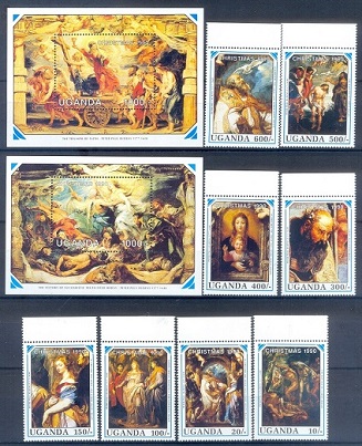 E347- Uganda 1990 Christmas paintings 2 S/S & complete set.